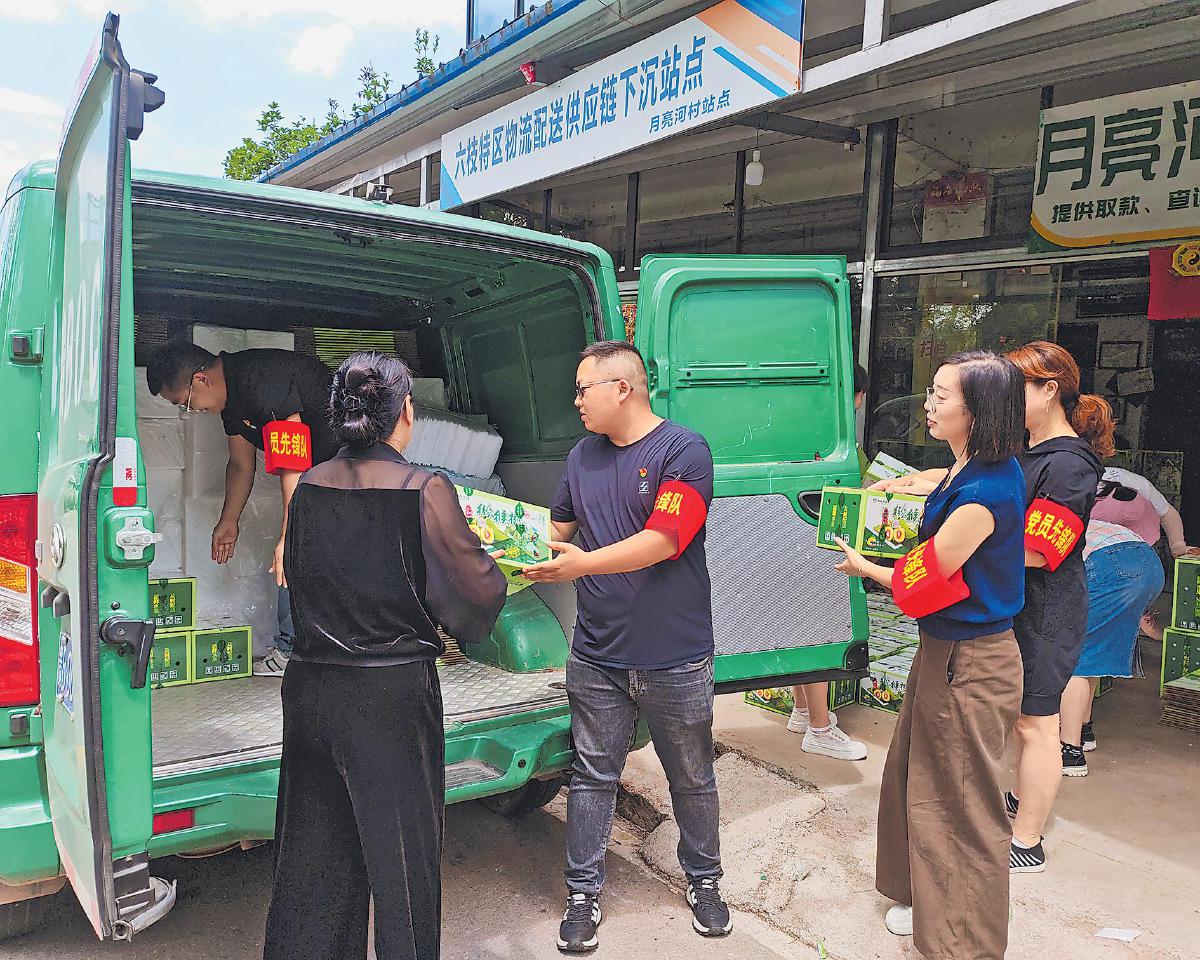 参加主题党日活动的党员将猕猴桃邮件装上邮车。