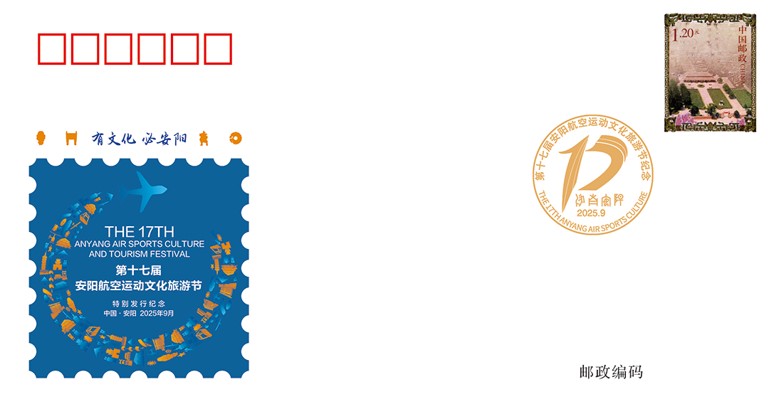 纪念封图案以湛蓝色为主调,铺陈出航空运动的广阔舞台;橙色点缀,彰显出运动的活力与热情。图案里,一架线条流畅的现代轻型飞机以昂扬的姿态直冲而上,仿佛正要冲破云霄,象征着航空运动探索未知、挑战极限的精神。飞机下方,殷墟宫殿宗庙遗址、文峰塔等安阳地标以剪影形式呈现,承载着这座城市三千年的厚重文脉。右上角的殷墟邮资图,巧妙呼应了“有文化 必安阳”的主题,将安阳的历史底蕴与航空运动的现代气息融为一体,展示了安阳城市独一无二的文化魅力。